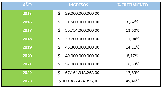 Como se evidencia en la Tabla 1, los ingresos totales del municipio de Segovia Antioquia tienen una tendencia de crecimiento año a año, el cual pasa de tener $29.000.000.000 en el año 2015 a tener ingresos por $100.386.424.396 en el año 2023, aumentando su capacidad financiera en 246,16%, su composición va desde sus ingresos corrientes entre tributarios y no tributarios, por otro lado, los recursos de capital.