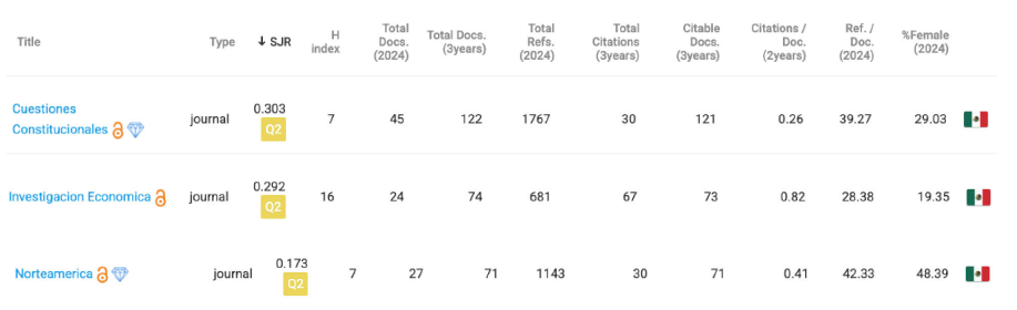 A su vez, en el área de ciencias sociales y económicas, las revistas Cuestiones Constitucionales (del Instituto de Investigaciones Jurídicas), Investigación Económica (de la Facultad de Economía) y Norteamérica (del Centro de Investigaciones sobre América del Norte) ascendieron al cuartil 2 (Q2) en 2024: