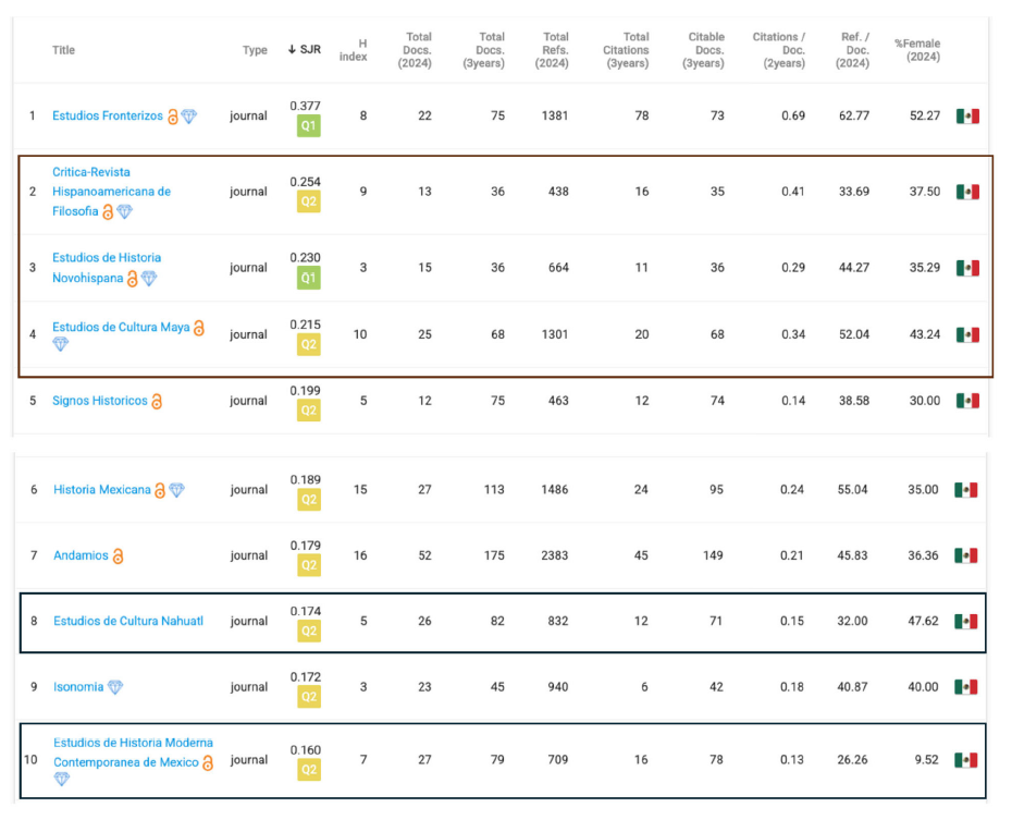La revista Estudios de Historia Novohispana, editada en el Instituto de Investigaciones Históricas de la UNAM, es la que se encuentra catalogada como Q1, precisamente desde el último ejercicio de medición realizado por Scimago en 2024: