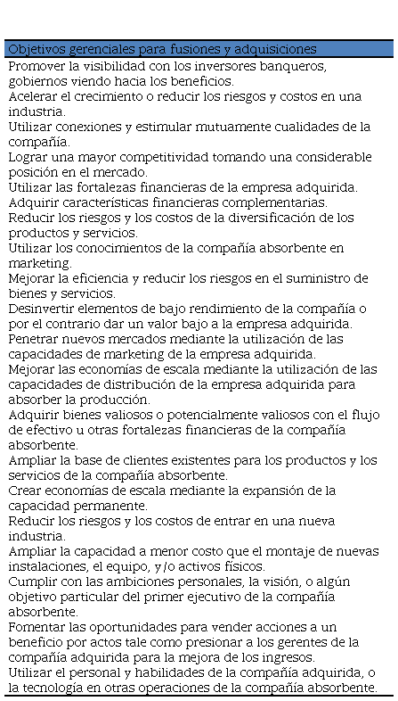 Para Walter y Barney (1990) los objetivos gerenciales que se deben de considerar para fusiones y adquisiciones de las organizaciones o empresas son los que se muestran en la tabla 1.