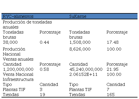 Existen diferencias que son notables entre SuKarne y RYC-alimentos en la producción, las ventas y la infraestructura; la revisión teórica y empírica menciona que se puede orientar a RYC a competir por su segmento de mercado ya consolidado. En la tabla 2 se muestra un comparativo de estas dos empresas con respecto a la producción, ventas totales y la infraestructura con la que cuanta cada una de ellas.