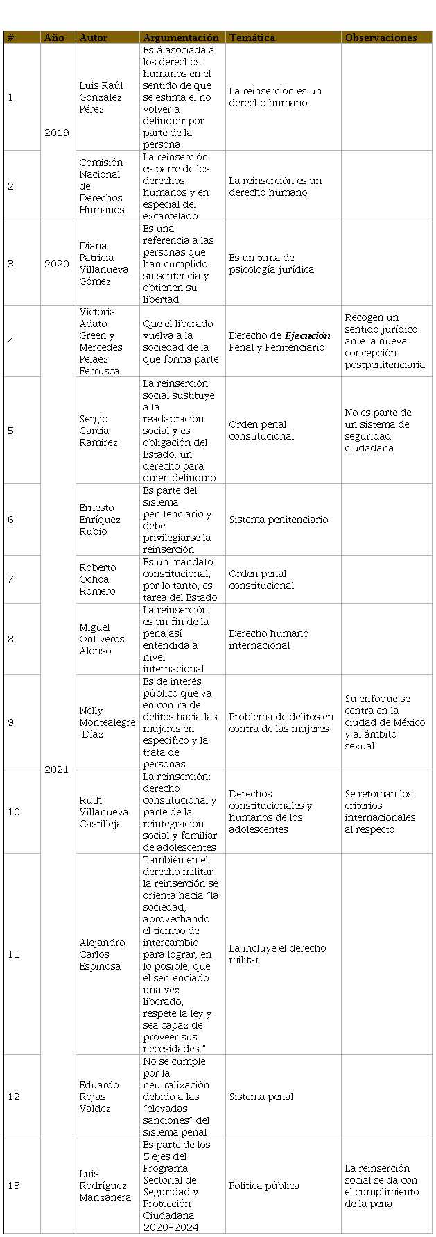 Por otro lado, el interés de gobiernos y legisladores locales por incluir y desarrollar (no todos a pesar de ello) en el cuerpo de la norma jurídica a la reinserción social es a partir de la segunda decena del presente siglo –vid el Cuadro 6-. Consideramos que uno de los pilares que dieron este resultado lo fueron los derechos humanos y su institucionalización. Durante los periodos 1999-1994 y 2021-2017 la temática de la reinserción social estuvo fuera, lo cual implicó que los estados de la República y sus respectivos gobiernos atendieron otras coyunturas del ejercicio del poder. Haciendo un primer balance sobre el presente trabajo, diremos que inicialmente en el final del siglo XIX y principios del XX, la reinserción social da inicio como una responsabilidad pública y del Estado argentino y en forma de patronatos privados, que en el futuro inmediato la reinserción de los excarcelados les dará la oportunidad de reincorporarse a las actividades económicas de sus patrocinadores (los donadores privados de los citados patronatos).