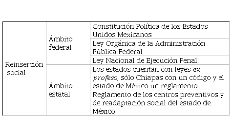 Como se mencionó al inicio, uno de los métodos de análisis es el jurídico y por lo tanto consideramos pertinente y hasta urgente hacer un estudio e interpretación sobre la legislación aplicable y/o que regula la reinserción social y de esta forma hacer un balance sobre el papel que el derecho juega en esta importante tarea estatal; por eso abordaremos los marcos legales de la reinserción social y la seguridad ciudadana (más adelante). El estado de México es un caso sui géneris debido a que como veremos los gobiernos hasta el momento en que se escribe el presente trabajo no han tenido interés en realizar una actualización jurídica sobre la reinserción limitándola a un simple ordenamiento administrativo (Chiapas a pesar de no contar con una ley, dispone de un Código al respecto). Apelando a la idea de que vivimos en un Estado de Derecho y la reinserción social es un derecho, en aquella entidad al parecer habría que decírselo a los responsables de ello. Iniciaremos en el ámbito federal para pasar a las leyes locales, en ambas categorías (la reinserción social y seguridad ciudadana).
