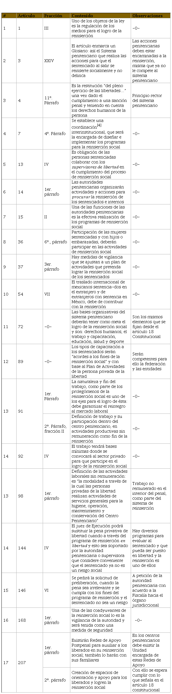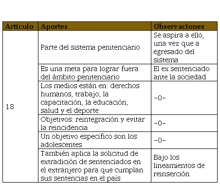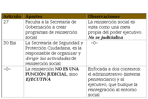 Esta ley es la que aborda con amplitud la reinserción social, por lo que la analizaremos con el siguiente cuadro.