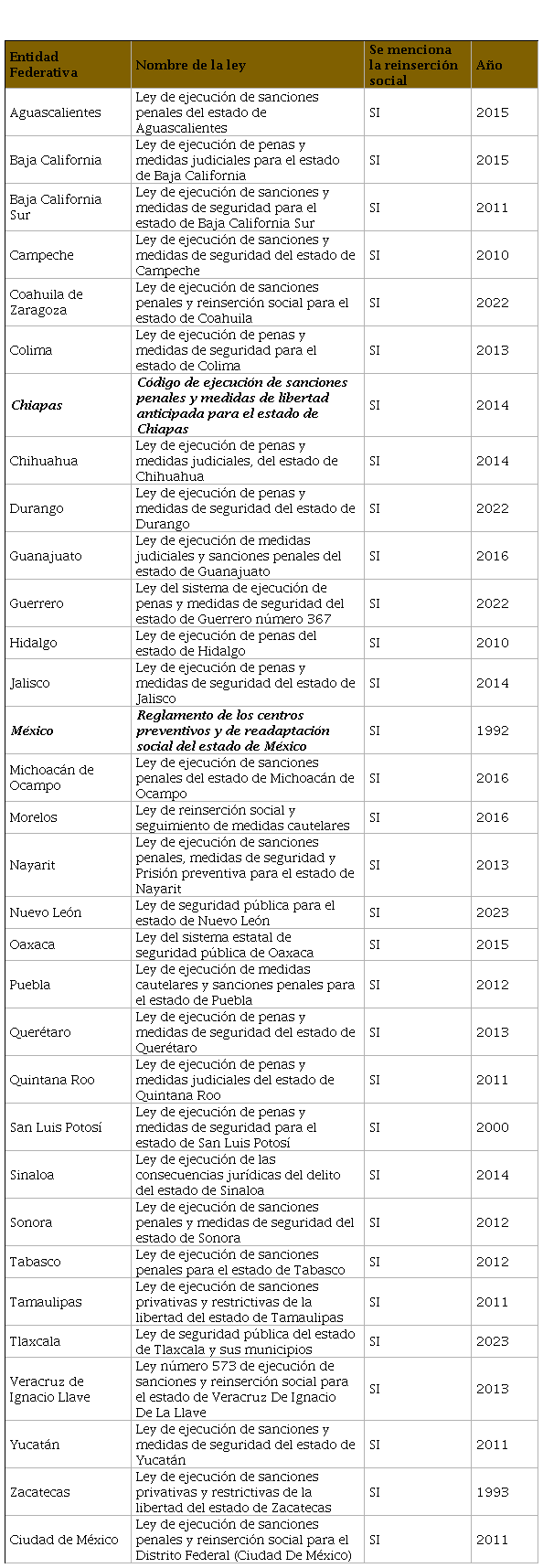 Fiscalía General del Estado de Chiapas (2014). Código de ejecución de sanciones penales y medidas de libertad anticipada para el Estado de Chiapas. https://www.fge.chiapas.gob.mx/Informacion/MarcoJuridico/PDFDocumento/B1D04FBD-A476-43C6-B993-E8DC8739DEF2#:~:text=Código%20de%20Ejecución%20de%20Sanciones%20Penales%20y%20Medidas,de%20Libertad%20Anticipada%20para%20el%20Estado%20de%20Chiapas.