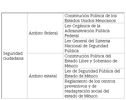 Abordaremos como se hizo con antelación, el marco legal de la seguridad ciudadana, que para nosotros es la real encargada de la reinserción social en el país. Empezaremos a nivel federal y centraremos –posteriormente- nuestro interés en el ámbito local, que para este caso ya sólo será en el estado de México, donde se circunscribe nuestra investigación.
