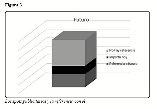 Con respecto a la visión de futuro planteada en los spots televisivos, esto solo es apelado en menos de un tercio de los spots. La mayoría de ellos no aborda la vida después de la pandemia, ni positiva ni negativamente, simplemente evitando mencionarla, mientras que dos spots enfatizan que el momento importante es la vida es el hoy. Esto es también reflejo del momento en que se realizaron estos spots televisivos, una etapa temprana de la pandemia con mucha incertidumbre sobre el futuro, lo cual es coincidente con lo observado en otras investigaciones donde se afirma que «todavía no hay espacio en la realidad para las consecuencias económicas, sociales y psicológicas que el Covid-19 está generando» (Tomba et al., 2020, p. 8).