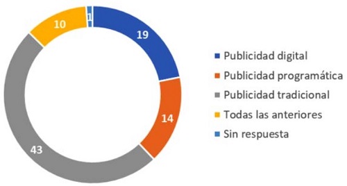 Los resultados de la encuesta revelan que el 49.43 % (43) de las microagencias publicitarias aún se inclinan hacia la publicidad tradicional, mientras que el 16.1% (14) ha adoptado la publicidad programática, el 21.84 % (19) se enfoca en la publicidad digital, y solo un 11.49 % (10) utiliza todas las anteriores. Esto indica que, aunque hay una apertura hacia las nuevas tecnologías, la publicidad tradicional sigue teniendo un papel predominante en la región (ver Figura 2).