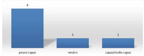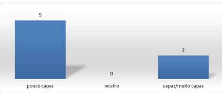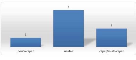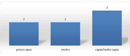 Utilizando também a escala Likert de cinco pontos, foi questionado o quanto as crianças se sentiam capazes de aprender a tocar uma música nova no violão. O resultado foi o seguinte: uma criança assinalou a parte negativa da escala, afirmando sentir-se pouco capaz de aprender a tocar uma música nova no violão; quatro crianças responderam de forma neutra e duas crianças afirmaram sentir-se capazes ou muito capazes de aprender a tocar uma música nova no violão (ver Fig. 3).
