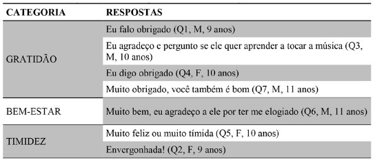 As respostas dos alunos foram agrupadas, considerando que um mesmo participante poderia dar respostas diversas que se aplicavam em diferentes categorias. As respostas foram asssim organizadas: (1) gratidão; (2) bem-estar; (3) timidez (ver Quadro 4):