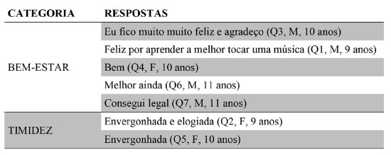 Mais da metade dos alunos afirmou sentir-se bem, feliz ou alegre ao receber um elogio do professor, mas é interessante destacar algumas respostas desta categoria que, além dos sentimentos positivos, denotam um senso de eficácia. Considerando a possibilidade de o professor elogiar a forma como está tocando, um aluno de nove anos escreveu que se sentiria: “(fico) feliz por aprender a melhor tocar uma música”; e um aluno de onze anos disse que comemoraria: “Consegui, legal”. De acordo com Azzi e outros (2014), elogios e feedbacks podem funcionar como uma forma de persuasão verbal na medida em que tendem a levar o indivíduo a acreditar que está conseguindo realizar a tarefa, fortalecendo seu senso de autoeficácia.