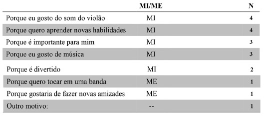 As crianças foram questionadas sobre os motivos que as levaram a decidir aprender violão. A pergunta foi realizada numa questão em formato de múltipla escolha com uma série de alternativas contendo respostas ligadas à motivação intrínseca (MI) e extrínseca (ME) ou amotivação (AM). Eles podiam assinalar mais de uma alternativa. Os dois motivos mais recorrentes foram “Porque eu gosto do som do violão” e “Porque quero aprender novas habilidades”, assinalados por quatro alunos; três crianças responderam “Porque eu gosto de música” e “Porque é importante para mim”; duas crianças assinalaram que decidiram aprender a tocar violão por ser divertido; e os motivos relacionados com o desejo de “tocar em uma banda”, de “fazer novas amizades” e “outro motivo” foram assinalados cada um por um aluno. Os demais motivos (que incluíam questões sobre a influência dos pais e amigos e sobre amotivação) não foram assinalados pelos alunos nesta faixa etária. Os motivos assinalados estão detalhados em ordem decrescente no Quadro 1: