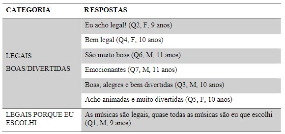 As músicas são legais, quase todas as músicas são eu que escolhi (Q1, M, 9 anos);