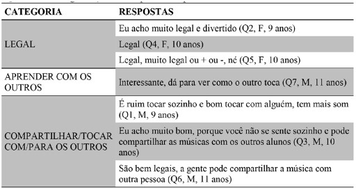 Outros três alunos citaram palavras como compartilhar, tocar com os outros ou para os outros. Esta categoria foi chamada de “compartilhar/tocar com/para os outros”. O ambiente de ensino coletivo proporciona um espaço de compartilhamentos de vivência de diferentes experiências vicárias, onde, além de poderem tocar juntos, é muito comum um aluno tocar para o outro ver, mostrando algo que aprendeu e motivando o outro a tocar também. Isso fica bem claro na resposta de um aluno de onze anos: “São bem legais, a gente pode compartilhar a música com outra pessoa”.