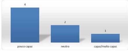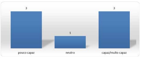 A outra questão relativa à experiência direta indagava sobre a capacidade de tocar uma música junto com os colegas (em grupo) e, de forma geral, as respostas ficaram bem distribuídas: três alunos afirmaram se sentir “pouco capaz” de tocar uma música junto com seus colegas, um respondeu de forma neutra e outros três alunos assinalaram que se sentiam capazes ou muito capazes de tocar uma música junto com seus colegas (ver Fig. 4).