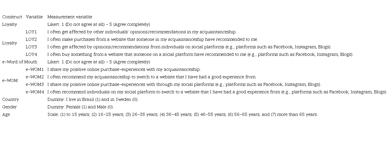 The survey was adapted from Roy et al. (2014). It included eight constructs, two control variables and a moderator for country. Created through Google Forms and then distributed primarily on the respective personal email addresses. Facebook also was utilized, as a great social media platform and with a high utilization rate in both countries, to gather the desired number of responses and given the context to consider the online consumer. The respondents of the online survey are undergraduate and graduate students enrolled at a large university in southern Brazil and another on the west coast of Sweden. This resulted in a cross-country sample. A total of 400 questionnaires were sent via social networks, 200 for each country, of which 388 were received and of which 380 were usable. The total sample comes from 222 females and 158 males.