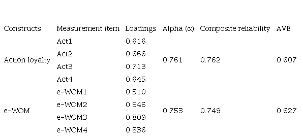 The authors (Roy et al., 2014) tested the chi-square values of 14 more degrees of freedom and were significant at p<0.001 level of significance. Therefore, the measurement scales of the constructs - Loyalty and e-WOM - are reasonably reliable and valid. Even so, confirmatory factor analysis was performed using Stata / MP 15 to confirm the variables that measure the constructions in the model. The reliability of the measurement model was examined by calculating Cronbach’s alpha coefficient for each of the constructs. We also report reliability. Table 3 shows that the value of the alpha coefficient for all constructions is greater than 0.7, which is considered acceptable (Hair et al., 2006). The values of composite reliability of the constructs are also greater than 0.7, which further strengthens the assessment of the reliability of the constructions.