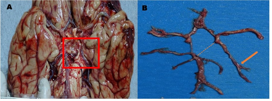 Masculino de 71 años, con antecedentes de hipertensión arterial y epilepsia que ingreso al hospital por sufrir síncope y traumatismo craneoencefálico. La autopsiamédico legal revelóhemorragia subdural, subaracnoidea e intraparenquimatosa frontoparietal izquierda procedente de la arteria cerebral posterior izquierda. Se encontró incidentalmente el origen de la arteria cerebral posterior izquierda en la arteria carótida izquierda; recuadro en A y ausencia de la arteria comunicante posterior izquierda, línea punteada y flecha en B.