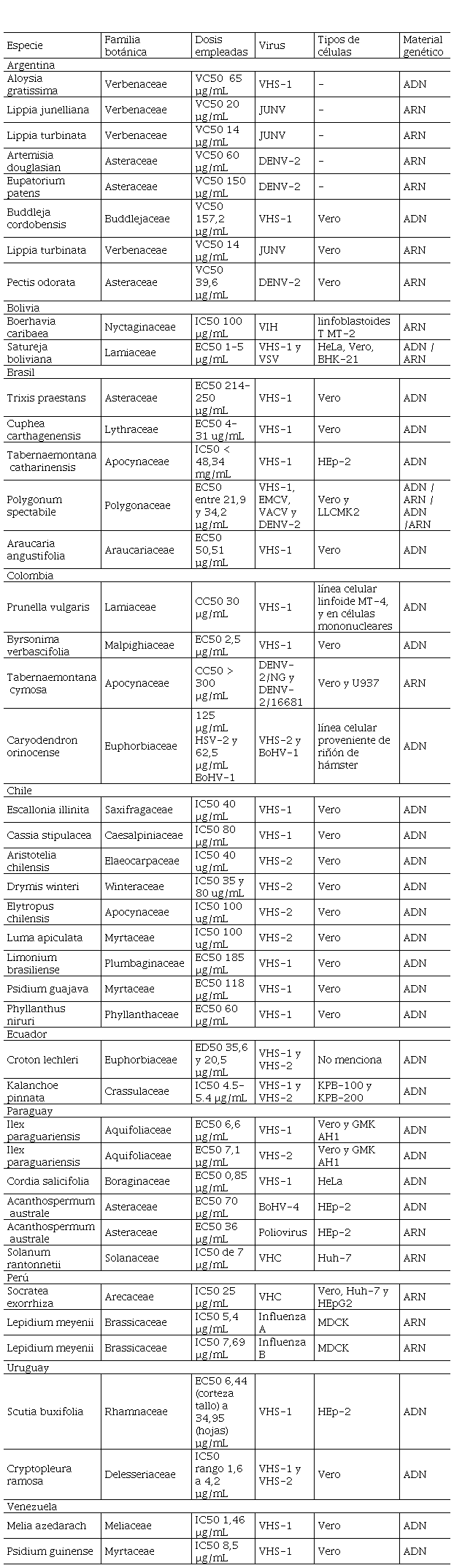 En la Tabla 1, se muestra un resumen de los estudios revisados respecto a la actividad antiviral in vitro de las plantas sudamericanas agrupadas por países.