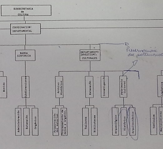 En ese marco, el Archivo Histórico no fue cerrado. De hecho, la estructura orgánica no sufrió demasiados cambios en cuanto al archivo, que siguió estando subordinado al Departamento de Investigaciones, que queda con 3 divisiones: Archivo Histórico, Folklore y Artesanía, Ciencias. La Resolución N°38 de abril de 1979 fija funciones específicas para los departamentos de la Dirección de Cultura, y respecto del archivo señala por primera vez funciones específicas, en las que se evidencian referencias a los principios de la disciplina archivística como los de procedencia, orden original, y preservación de autenticidad e integridad documental. Aunque desconocemos quién redactó el documento, es posible suponer que se trataba de personal en el archivo que había recibido las capacitaciones señaladas en párrafos previos.19