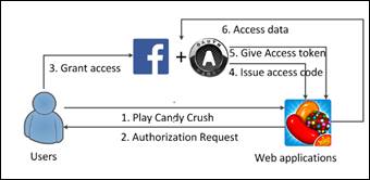 OAuth is an open authorization standard that allows users to grant an OAuth client application to access the resource stored in the OAuth server without sharing their credentials ( Ferry, Raw, & Curran, 2015). OAuth is one of the popular token-based authentications that allows users to access the applications by logging on their existing accounts such as Facebook, Twitter and Google. As steps 1 and 2 in Figure 1 show, when a user wants to play Candy Crush, it will ask him or her to authorize it to access the user?s data on Facebook. Doesn?t like earlier system X?s case, Candy Crush asks the user to enter his or her Facebook?s username and password ?on Facebook? to grant itself particular permissions as step 3 shows. Once Candy Crush is authorized by the user, Candy Crush will be given a token via OAuth for accessing the required user?s data from Facebook (see steps 4 to 5 in Figure 1).