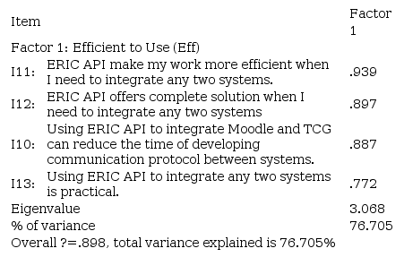The research team first calculated the usability score based on the Brooke?s equations (https://uiuxtrend.com/measuring-system-usability-scale-sus/). The usability score?s value should be falling between 0 to 100. After that, the research team reversed the five negative worded SUS items before doing further validity and reliability tests. The research team used SPSS 20.0 to verify the questionnaire and the collected data?s validity and reliability. Fourteen items had to be removed because of their low contribution toward the factors. The overall Cronbach?s alpha value of the remaining twenty items is 0.928, which sits in the ?excellent? range and shows that questionnaire is reliable ( Georage & Mallery, 2010). Table 3 lists the analysis result of Effectiveness factor: two sub-factors are discovered, which are Ease of Learn (EoL) and Ease of Use (EoU). Table 4, on the other hand, lists the analysis results for the Efficiency factor.