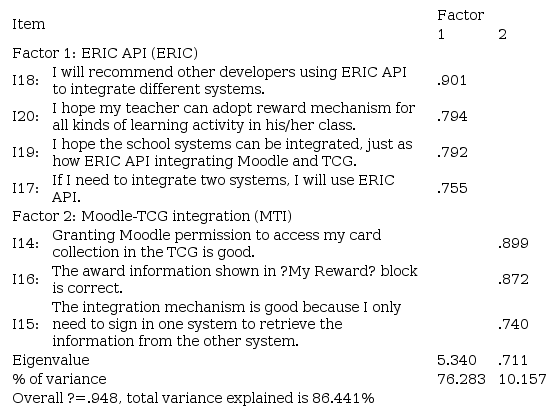 The five hypotheses proposed in Figure 6 are verified through the Pearson correlation analysis. The results show that when students perceive positive on the effectiveness of the integration of Moodle and Trading Card Game and the efficiency for them checking out the rewards they have received from what they have done for the learning activities, they will have higher intention of using more ERIC API enabled integrated systems. Moreover, they also have higher intention of having cards in Trading Card Game as educational rewards in other courses later.