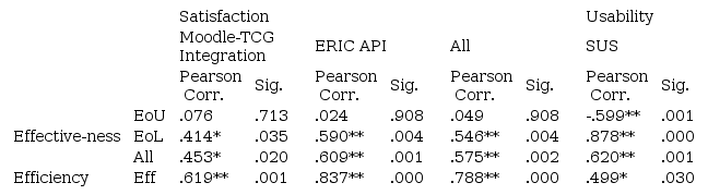 The hypothesis H5 is also verified. The Pearson Correlation Coefficient between usability score and Satisfaction factor is r = .530, p = 0.005. Moreover, the Pearson Correlation Coefficient between the usability score and the two sub-factors of Satisfaction (Moodle-TCG Integration and ERIC API) are r = .427, p = .030 and r = .556, p = .003 respectively. This result is in line with the assumption of when a user is more satisfying with a system he or she may score it higher.