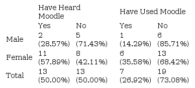 Table 1 summarizes students? experience with Moodle. Half of the students have heard what Moodle is, but only seven (26.92%) have used Moodle before. There is no gender difference in the experience with Moodle. The result of chi-square test of gender in ?I have heard what Moodle is? question is ?2 (1, N = 26) = 1.759, p < .189 and ?I have used Moodle before? question is ?2 (1, N = 26) = 0.778, p < .365.