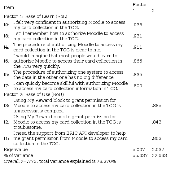 First of all, we find out that the ease of learn in the Moodle-TCG integration has positive relation to students? satisfaction on Moodle-TCG integration and ERIC API usage as well as their perceived usability toward the Moodle-TCG integration. On the other hand, students? technology background is the only moderator that will affect their perceived ease of learn. The analysis results show that students who are capable of developing systems with more programming languages believe the process of authorizing Moodle to access their data in Trading Card Game is easy to learn. However, neither all of the students in this study nor all of the users in the world are familiar with programing languages and are system developers. Therefore, designing an easy to learn user interface for the Moodle-TCG integration becomes an important issue.