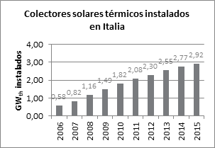 En cuanto a la inserción de la energía solar térmica, según datos de ESTIF (2018), en Italia, y a pesar de la crisis económica, la energía solar se confirma como el segundo mercado europeo con un total instalado 2,92 GWth (4,14 millones de m²; Figura 9), principalmente gracias a la aplicación del programa de ?Detrazione fiscale? y, en menor medida, el ?Conto Energia Termico?. Cabe señalar que en toda Europa se han instalado unos 35,13 GWth (más de 50 millones de m2).