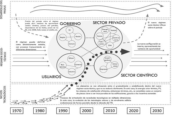 Por lo tanto, el paisaje ?o contexto- presionó directamente sobre los Estados de la UE para que los mismos comenzaran a sostener transiciones en sus sistemas energéticos, a partir de fortalecer y hacer emerger tecnologías que se venían desarrollando intensamente en nichos desde mediados de la década del setenta. Los acuerdos ambientales generaron un peso considerable en materia política y, por ende, algunas administraciones decidieron adoptarlos como políticas activas ( Gaspari, 2018) y, en ciertas poblaciones, fueron considerados como factores de importancia ( Fini, 2018). Por consiguiente, se entiende que actualmente en Italia se está desarrollando una transición de un régimen socio-técnico inicial con usuarios consumidores de baja eficiencia energética, hacia un régimen futuro con usuarios prosumidores de alta eficiencia energética.