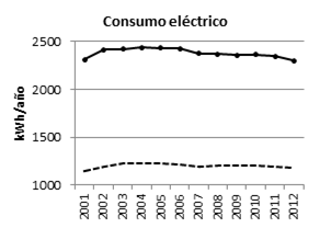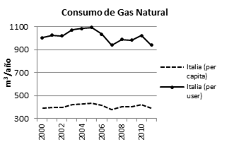 En cuanto a los patrones de consumo energético residencial, en las Figura 3 y Figura 4 se puede observar que: la demanda de electricidad por usuario bajó de un promedio de 2407 kWh/año (2001-2006) a 2298 kWh/año en 2012; mientras que la demanda de gas natural por usuario pasó de un promedio de 1054 m3/año (2001-2006) a 938 m3/año en 2012. Esto significa una reducción del 4,5% y 11,0% respectivamente.