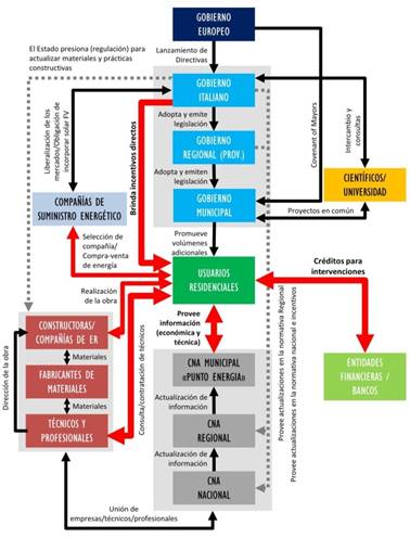 A modo de síntesis, la Figura 5 expresa la actual configuración del régimen socio-técnico. Allí puede observarse la interacción entre los diferentes grupos sociales o actores: las distintas escalas de gobierno, UE, Italiano, Regional, Municipal; el sector científico-universitario; el sector financiero; el sector privado (empresas energéticas, constructoras, fabricantes de materiales, profesionales/técnicos); asociaciones público-privadas como la CNA y el municipio; y usuarios. Es notorio que para la efectiva promoción de las innovaciones tecnológicas, se precisa de la alineación de diferentes fuerzas para promover los cambios. En este sentido, en la siguiente sección se describe el proceso de inserción de tecnologías de ER y EE en el medio real.