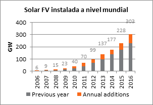 En cuanto a la energía solar fotovoltaica, a nivel internacional, ésta tuvo sus primeras aplicaciones masivas dentro de la industria espacial, principalmente en la década de 1960. Luego, en la década de 1970, a partir de la crisis del petróleo, se incrementó la inversión destinada a I+D en este campo, logrando mejorar el desarrollo de las celdas. En consecuencia, se logró descender su precio desde 100 USD/W hasta 40-20 USD/W (Solar Power Authority, 2018). Esto posibilitó su utilización en diversos tipos de instalaciones, entre ellas edificios y plantas de generación. A partir de mediados de la década del 2000, se produjo un nuevo descenso en los costos de los sistemas hasta alcanzar el valor de 4,50 USD/W en 2010 y 1,79 USD/W en 2017 ( IRENA, 2017), principalmente por la ampliación de las economías de escala en países como China. En este sentido, su penetración a nivel mundial se ha incrementado exponencialmente, pasando de 6 GW instalados en 2006 a 303 GW instalados en 2016, tal como se observa en la Figura 6.