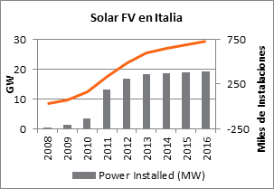 En base a los instrumentos utilizados para incentivar el uso de la energía solar FV, Italia ha incorporado unos 19,3 GW de los mencionados 303 GW instalados a nivel mundial. Sin embargo, tal como se puede verificar en la Figura 7, con el fin del incentivo de ?Conto Energia? en 2013 en Italia se desaceleró el ritmo de incorporación de potencia instalada en FV. Por su parte, a pesar de los esfuerzos positivos impulsados en distintos sectores del sistema eléctrico italiano, la gobernanza y la regulación del mismo no han avanzado al mismo nivel que la incorporación de la tecnología, lo cual impide el desarrollo de los mercados eléctricos dispersos. ( Gaspari y Lorenzoni, 2018)