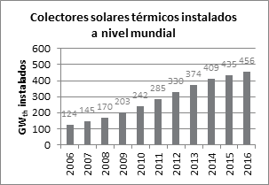 A nivel internacional, el primer lugar en hacerse extensivo el uso de la energía solar térmica para el calentamiento de agua fue en el Estado de California entre 1900 y 1920, como así también en el sur del Estado de Florida entre 1920 y 1940 ( NAS, 1976). Luego de 1950, los diseños de colectores solares fueron mejorados sustancialmente por países como Israel, Australia y Japón, que en la década del 1970 comenzaron a implementarlos de forma extensiva. Los principales avances logrados en la década de 1990 en la tecnología y producción de tubos de vacío de vidrio permitieron a China desarrollar una línea de producción de diseño propio y comenzar la producción en serie de calentadores de agua solares del tipo Heat Pipe. Todos estos logros en investigación, puesta en la producción, han contribuido a la mejora constante del rendimiento de los colectores y su consecuente reducción de sus costos, lo que generó un fuerte impulso a la industria termosolar de China y, por consiguiente, de numerosos países a nivel mundial ( Runqing, Peijun y Zhongying, 2012). En relación a ello, se estima que la potencia instalada pasó de 124 GWth en 2006 a 456 GWth en 2016 -equivalente a unos 646 millones de m2-, cuyo incremento muestra un comportamiento prácticamente lineal - Figura 8-. ( REN 21, 2017)