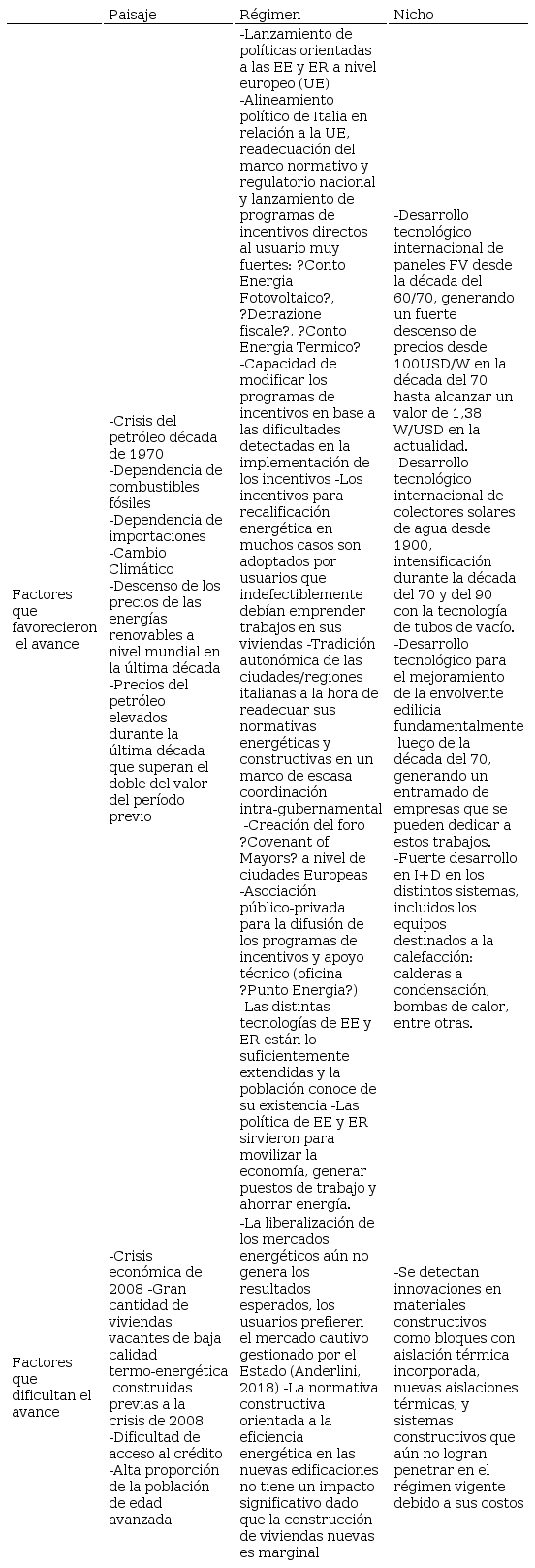 En función del análisis del caso de estudio italiano, se identifican factores clave que han contribuido o dificultado el avance en la implementación de las nuevas tecnologías. Esta síntesis, a su vez, es de utilidad para generar insumos que sean de utilidad a la hora de la implementación de políticas públicas para el mejoramiento energético en otros países. Para ello, se estructuró la sistematización de la información mediante los niveles de paisaje-régimen-nicho ( Tabla 3). A partir de esto es posible discutir aspectos fundamentales que necesariamente deben ser tenidos en cuenta en cualquier caso de estudio a la hora de implementar políticas para la promoción de EE y ER.
