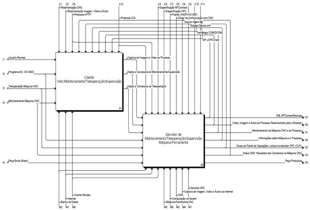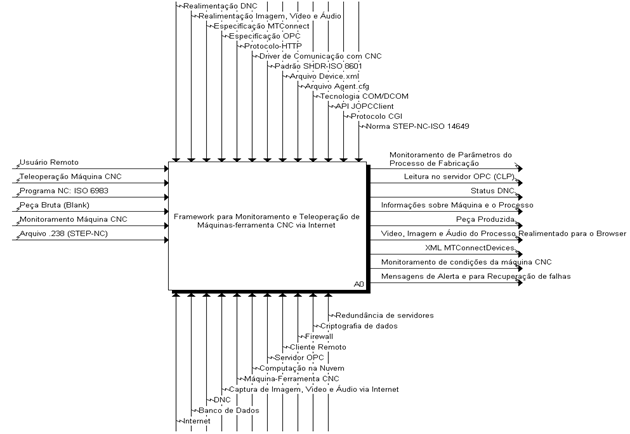 Essencialmente, as entradas de um sistema projetado a partir dessa arquitetura contam com a atividade de monitoramento, a teleoperação, usuários situados remotamente, a peça bruta ( blanck), que é uma entrada para a máquina-ferramenta onde está situado o CNC, e o programa NC, que contem os comandos de fabricação de uma peça. Foi incluído nas entradas do modelo um arquivo ?.238? como uma proposta para potenciais trabalhos utilizando controladores compatíveis com o padrão STEP-NC.