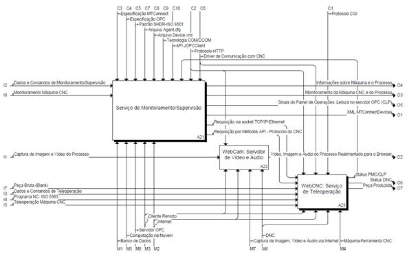 A Figura 3 mostra a estrutura e as comunicações dos servidores do framework. Na arquitetura proposta o monitoramento é realizado pelo serviço designado como Monitoramento/Supervisão (A21), que tem como insumos principais dados e comandos que formam basicamente requisições web. As saídas dessa atividade envolvem dados de supervisão e informações relacionadas ao status da máquina e do processo. A atividade A22, servidor WebCam, que provê serviços streaming de vídeo e áudio, é parte dos recursos de teleoperação. Por sua vez, O servidor WebCNC (A23) está diretamente vinculado ao CNC da máquina-ferramenta. Este serviço concentra os algoritmos que fornecem os comandos associados a funções de DNC que são executadas no controlador da máquina.