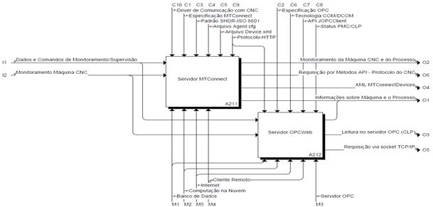 O serviço de Monitoramento/Supervisão (A21) ainda é subdividido em servidor de monitoramento MTConnect (A211) e o servidor OPC de supervisão via Internet, OPCWeb (A212), conforme mostra a Figura 4. O servidor MTConnect efetua o monitoramento principalmente através de streaming de dados de fabricação em formato XML, com a estrutura de dados definida pelo esquema MTConnectDevices. O servidor OPCWeb recebe entradas na forma de dados e comandos para requisição de dados de saída com o status recente de parâmetros de PLC ou para alterar esses parâmetros e efetuar o acionamento de controles da máquina-ferramenta CNC.