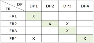 Finalizado o processo de decomposição e eliminadas as inconsistências das matrizes de projeto dos subníveis (DM1.x, DM2.x, DM3.x e DM4.x) da hierarquia de requisitos funcionais (FR) e parâmetros de projeto (DP), obtém-se a Matriz de projeto ( Design Matrix, DM) completa. Esta matriz corresponde à junção das matrizes resultantes da decomposição dos parâmetros de projeto do Quadro 1.