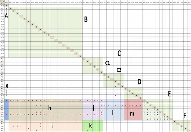 A matriz de projeto completa é rearranjada a fim de aproximar os módulos com maior afinidade em termos de similaridade tecnológica ou finalidade dentro do projeto. O resultado dessa tarefa é representado pela matriz da Figura 6.