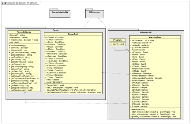 Os elementos de software identificados na definição da arquitetura como subsistemas programáveis e exequíveis através de linguagens de programação orientadas a objeto foram tratados através de uma abordagem acessória conhecida como Projeto Axiomático de Sistemas de Software Orientados a Objeto ( Axiomatic Design of Object-Oriented Software Systems, ADo-oSS) em que um dos principais resultados é o mapeamento dos módulos da matriz em diagramas de classes. A Figura 8 ilustra o diagrama de classes obtido a partir do mapeamento dos módulos associados ao Adaptador MTConnect na matriz de projeto completa.