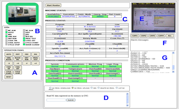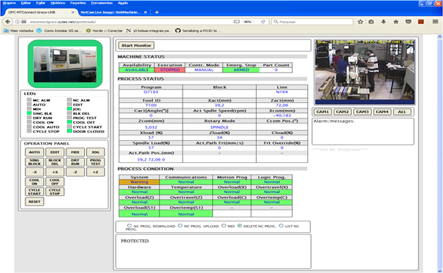 A interface Web cliente assume a função de elemento integrador dos servidores implementados da arquitetura do sistema, agregando controles que fazem requisições e recebem respostas na forma de dados e informações através dos servidores MTConnect, OPCWeb, WebCam e WebCNC. Todos esses serviços são reunidos no cliente web desenvolvido para monitoramento e teleoperação através da internet utilizando um software browser. Esse cliente, que é apresentado na Figura 9, é formado pelos seguintes componentes: