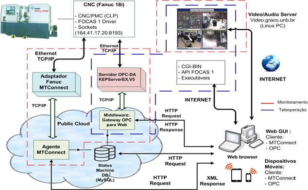 Os serviços de monitoramento e supervisão baseiam-se essencialmente na aquisição de dados através de um servidor MTConnect, composto do servidor do CNC, software Adaptador e software Agente; e de um servidor OPC, projetado para receber e transmitir dados através da Web por meio da associação entre um software servidor OPC-DA e um middleware com função de gateway.