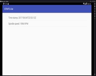 Com auxílio dos controles de supervisão e comando remoto DNC da interface de usuário do CyberDNC, o parâmetro de velocidade rotacional ( Spindle Speed) foi ajustado para três velocidades: 1000, 2000 e 3000 rpm. O resultado desses comandos foi transmitido para a aplicação com uma resolução de tempo nominal de 500 ms (milisegundos). A Figura 11 exibe o registro de quando a velocidade nominal do spindle foi alterada para 2000 rpm. Esses dados foram transmitidos para uma aplicação Android chamada GTMTC-Lite, um cliente MTConnect para dispositivos móveis. Esse teste foi uma constatação da versatilidade desse sistema ao transmitir e receber dados via internet independente de plataforma.