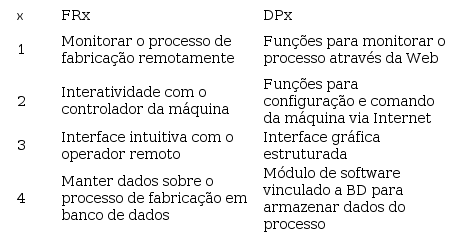 Nesse mapeamento de primeiro nível (FRx/DPx) verificou-se um significativo grau de desacoplamento, ou seja, há uma maior independência dos requisitos funcionais (Axioma 1) em relação aos parâmetros de projeto que o realizam. Mas percebe-se que nem todos os FRs da matriz estão associados a um único DP correspondente, FR2possui uma relação com DP3, e FR4 com DP1. Durante o processo de abstração para a definição dos parâmetros de projeto concluiu-se haver uma relação entre a interatividade com controlador da máquina (FR2) com a construção de uma interface gráfica estruturada ( DP3). Observou-se uma correlação entre manter dados sobre o processo em banco de dados ( FR4) e a função de monitorar o processo via Internet ( DP1). No entanto, com base em Suh (2001), um projeto aceitável, os parâmetros de projeto (DPs) e os requisitos funcionais (FRs) estão relacionados de tal forma que um DP específico pode ser ajustado para satisfazer um FR sem afetar outros. Com isso, os mapeamentos FR x DPfora da diagonal poderiam ser suprimidos sem afetar significativamente os mapeamentos posteriores.