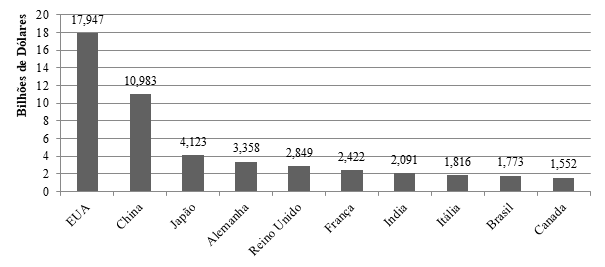 O PIB é soma de tudo aquilo que é produzido durante um determinado período de tempo. Além disso, há também o Produto Interno Bruto Real, que representa o valor dos bens e serviços produzidos pela nação subtraído do valor dos bens e serviços utilizados em produção ( BEA, 2016). A Figura 3 mostra os dez países com maior PIB no mundo.