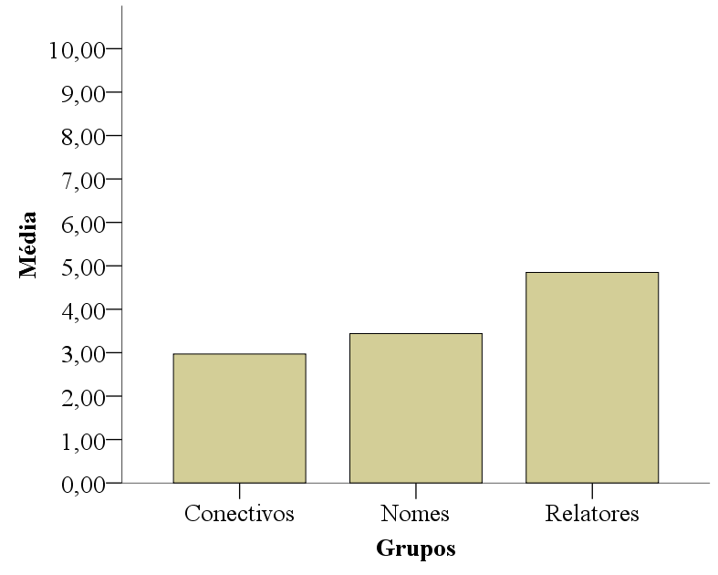 No T, a maioria dos vocábulos pertencem ao grupo dos nomes (Gráfico 1). Todavia, não foi deste grupo a maior média da nota (Gráfico 2). O grupo dos relatores alcançou a maior média de acertos e os conectivos a menor.